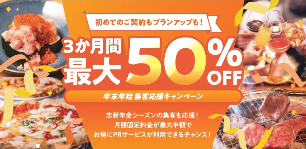 食べログから2025年9月29日に発表された「年末年始集客応援キャンペーン」です。11月・12月掲載開始・プランアップ限定で、掲載開始月より3ヶ月間、お申込みいただいたプラン料金が最大50%OFFでご利用いただけるキャンペーンです。