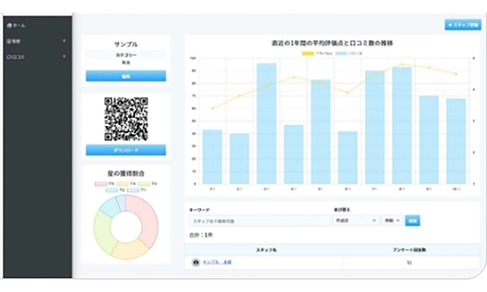 アンケートの回答内容や評価点数の推移は管理画面で確認が可能。口コミの質向上のために必要な施策を考えることにも役立ちます。